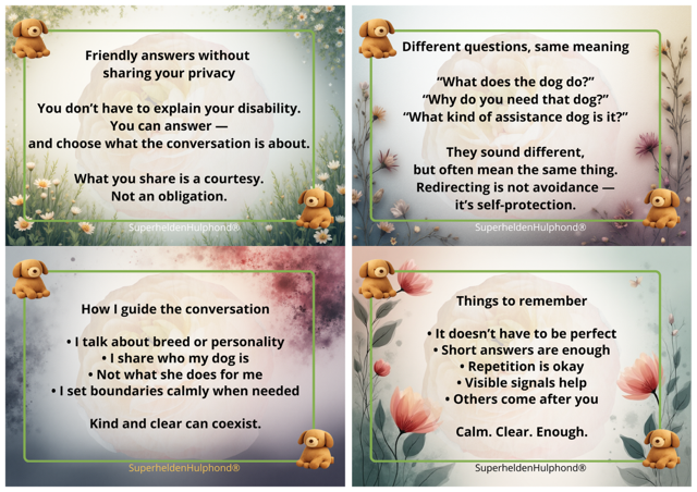 Friendly guidance for assistance dog handlers on answering public questions without sharing medical details, while protecting privacy and access.